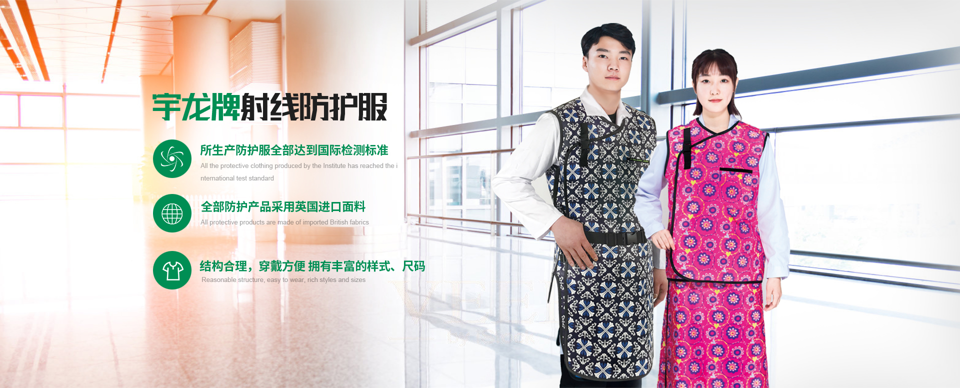 龙口龙跃医疗器械有限公司专业研发、生产、销售"宇龙"牌医用铅衣防护服,患者防护产品,性腺防护服,射线防护衣,X射线防护产品,患者防护服,介入铅衣,x射线防护服,铅背心,铅眼镜,铅屏风,进口铅衣,介入手套,铅防护围领,防护面罩,防护眼...